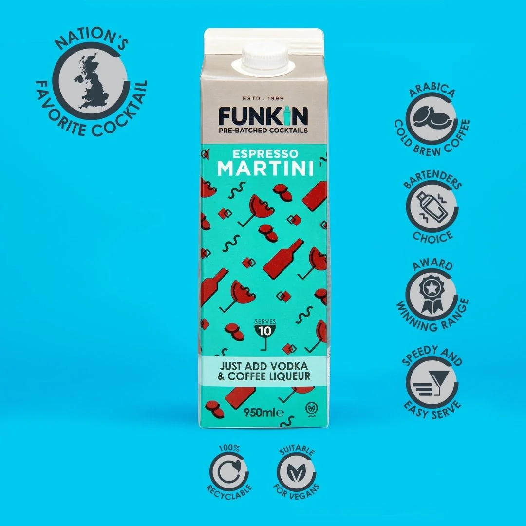 Rich, indulgent, and energising â Funkin Espresso Martini Mixer is an expert blend of the finest cold brew coffee to enjoy at home. Looking for an espresso martini kit or gift set that will help you make your favourite cocktail from home quickly and easily? Simply mix 25ml of Vodka, 25ml of Coffee Liqueur and 95ml of our bestselling mixer in a Boston shaker, give it a good shake and garnish with coffee beans. Smooth.