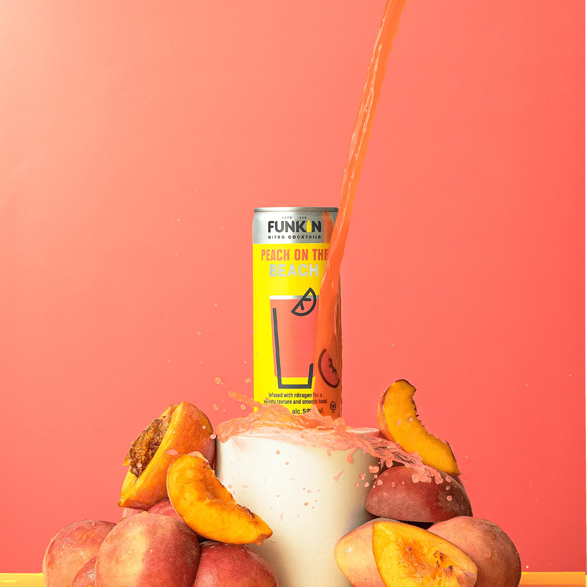 Sun, sand and sweet vibes. Funkin Peach on the Beach is a bold blend of peach cranberry, orange juice, and a kick of vodka. Now available in ready-to-drink Nitro Cans, expect the same great taste and texture of a bar-quality cocktail – at the crack of a can.Â