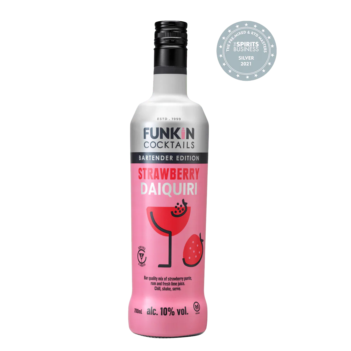 Quench your thirst quicker with Funkin’s ready to drink, pre-mixed Strawberry Daiquiri. We’ve bottled up all the best ingredients you’d expect from a bar-quality cocktail. No chopping, mixing or straining. Just pour your cocktail at home, garnish with a strawberry, and enjoy. Best served chilled.